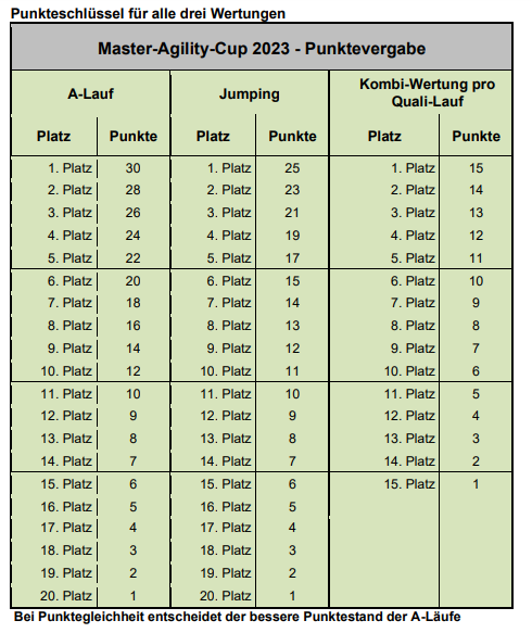 • Rang 1 - 25 Punkte, Rang 2 - 22 Punkte, Rang 3 19 Punkte, Rang 4 17 Punkte, Rang 5 16 Punkte usw. Punkte nur für Wertnote V (<5,99 Fehlerpunkte)
